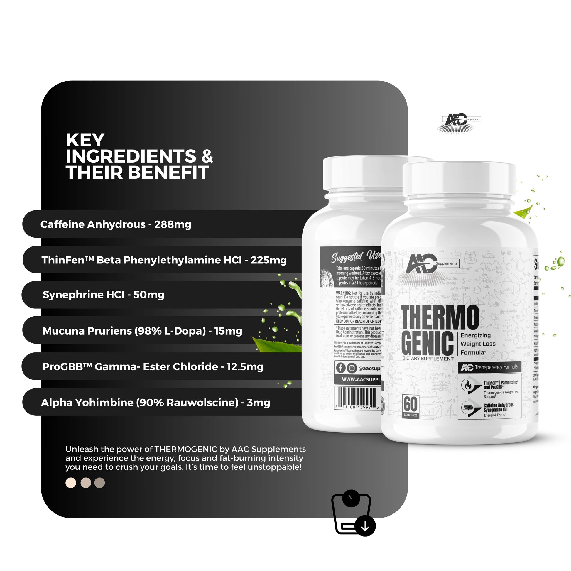 THERMOGENIC by AAC Supplements is your ultimate energizing weight-loss companion. Designed with precision and powered by science —this formula is packed with potent ingredients to help you burn fat, boost energy and stay focused.